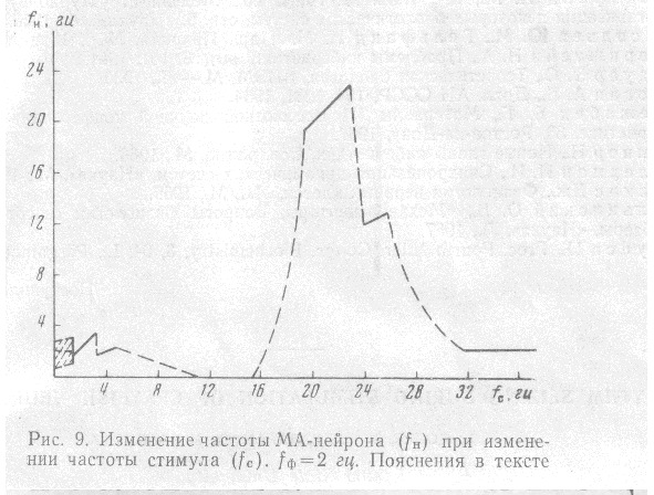 Вхождение в эту область предваряется участком вероятностной реакции, которая может быть обнаружена и при переходе от режима 1:1 к 2:1 и затем после последнего (на рис.9. в интервалах 23—24 и 26—32 соответственно). При частотах выше 32 не удается обнаружить воздействие стимула данной амплитуды на импульсную активность МА, нейрон возвращается к исходной фоновой активности. гц гц