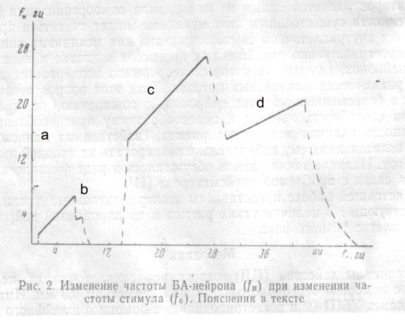 Если f находится за пределами зон ЗЧ, то БА-нейрон некоторое время τ, зависящее от fи амплитуды стимула, работает с частотой f= f, затем адаптируется и прекращает импульсную активность (рис. 5). c c н c