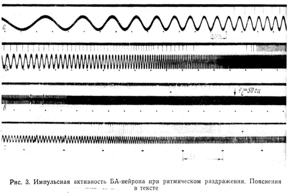 Для кибернетического рассмотрения наибольший интерес имеет представление о том, что отдельный нейрон может обладать набором резонансных ритмов, позволяющих избирательно реагировать на входной поток импульсов. Полученные данные свидетельствуют в пользу такого предположения.