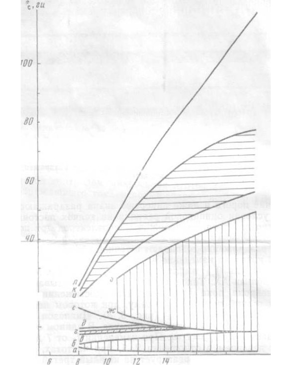 Результаты можно объединить с помощью рис.4. Линия представляет собой геометрическое место точек, соответствующих началу первой полосы ЗЧ с отношением частот f: fa равным 1:1. Линия б соответ ствует переходу в вероятностный режим, – началу первой полосы ЗЧ с отношением частот 2:1, – ее окончанию и – исчезновению импульсной реакции. Линия соответствует началу новой полосы ЗЧ. а в г д е c