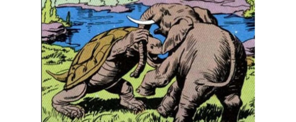 Долгая война между огромными чудовищами слоном Супратикой и черепахой Вибхавасой напрягала богов, и они отправили Гаруду разобраться с этой проблемой.