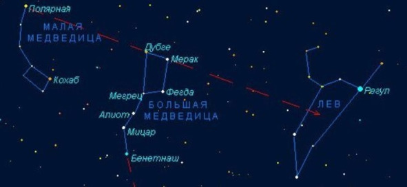 На рисунке наглядно отображено то, о чем говорится в этом фрагменте: проекция линии, соединяющей две звезды Дубге и Мерак (Пулаха и Крату) созвездия Большой медведицы (Саптариши), на созвездие Льва.