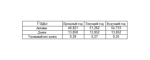 Для текущего года этот показатель равен: 13,852/51,262=0,27. То есть, в каждом рубле ресурсов содержится 27 копеек заемного капитала.