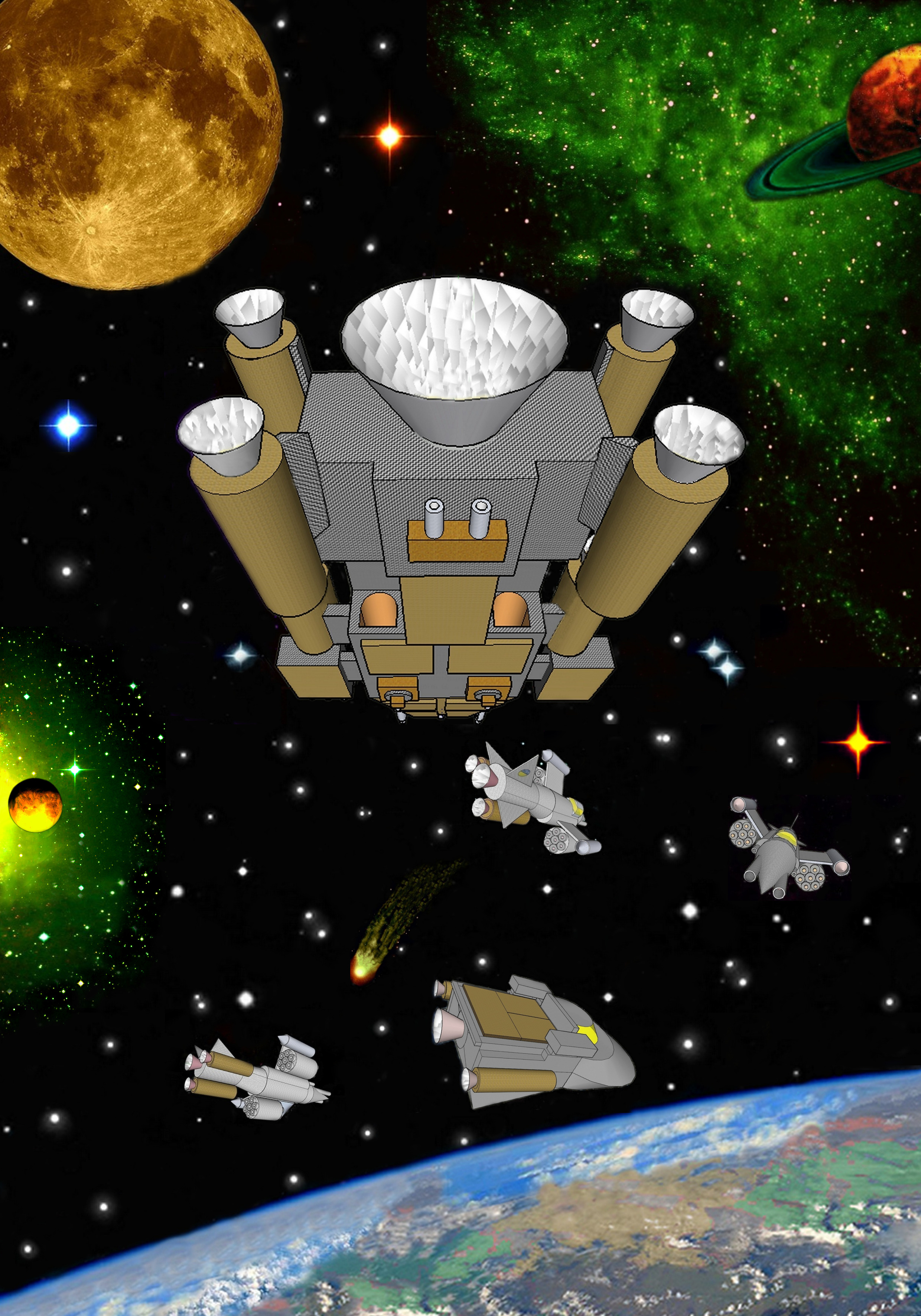 Все те корабли, которые принимали участие в бурении ядра и закладке вовнутрь каких-то непонятных контейнеров. Выстроившись опять полусферой, но уже с другой стороны. Вместе почти рядом с ядром, превратившись в извозчиков, двинулся в путь. Медленно, но, уверенно набирая скорость, двигались в сторону Земли. Ядро «Фаэтона», дрогнув, медленно тихо сошло с орбиты. Как бы с большой неохотой, изменив своё привычное направление, двигалось вслед за армадой кораблей, в сторону Земли. Мы на взгляд быстро прикинули, по размерам это большое ядро было один в один схоже с размерами нашей Луны. Сашины догадки при бурении ядра оказались верными, он ещё тогда, доказывал: «Это будущая наша Луна», его тогда никто не поддержал. Просто не могли никак себе представить, что такое огромное ядро, возможно, сорвать с его орбиты и куда-то транспортировать. Выключив защиту корабля, мы не спеша двигались вслед за этим ядром и его тягачами. Скорость перемещения тягачей с огромным прицепом была очень малой по сравнению с нашим новым кораблём, они под большой нагрузкой двигались очень медленно и тяжело. Саша заявил: «Так мы будем плестись долго и нудно». Высчитав время перелёта к Земле, с такой скоростью полёта, расчёты показали пять месяцев и десять дней. Мы двумя кораблями отправились к Земле, чтобы возле планеты совершить опять прыжок на это время вперёд. Ну не плестись же нам в хвосте с такой малой скоростью. Выбравшись из подпространства, минуя во времени пять месяцев и девять дней, поднявшись на орбиту, мы стали ждать появления эскорта мощных тягачей с «прицепом» будущей Луны. Через время, приближаясь по эллипсной кривой к Земле, инопланетяне завели будущую Луну в гравитационное поле Земли, придав ей при этом нужное вращение.