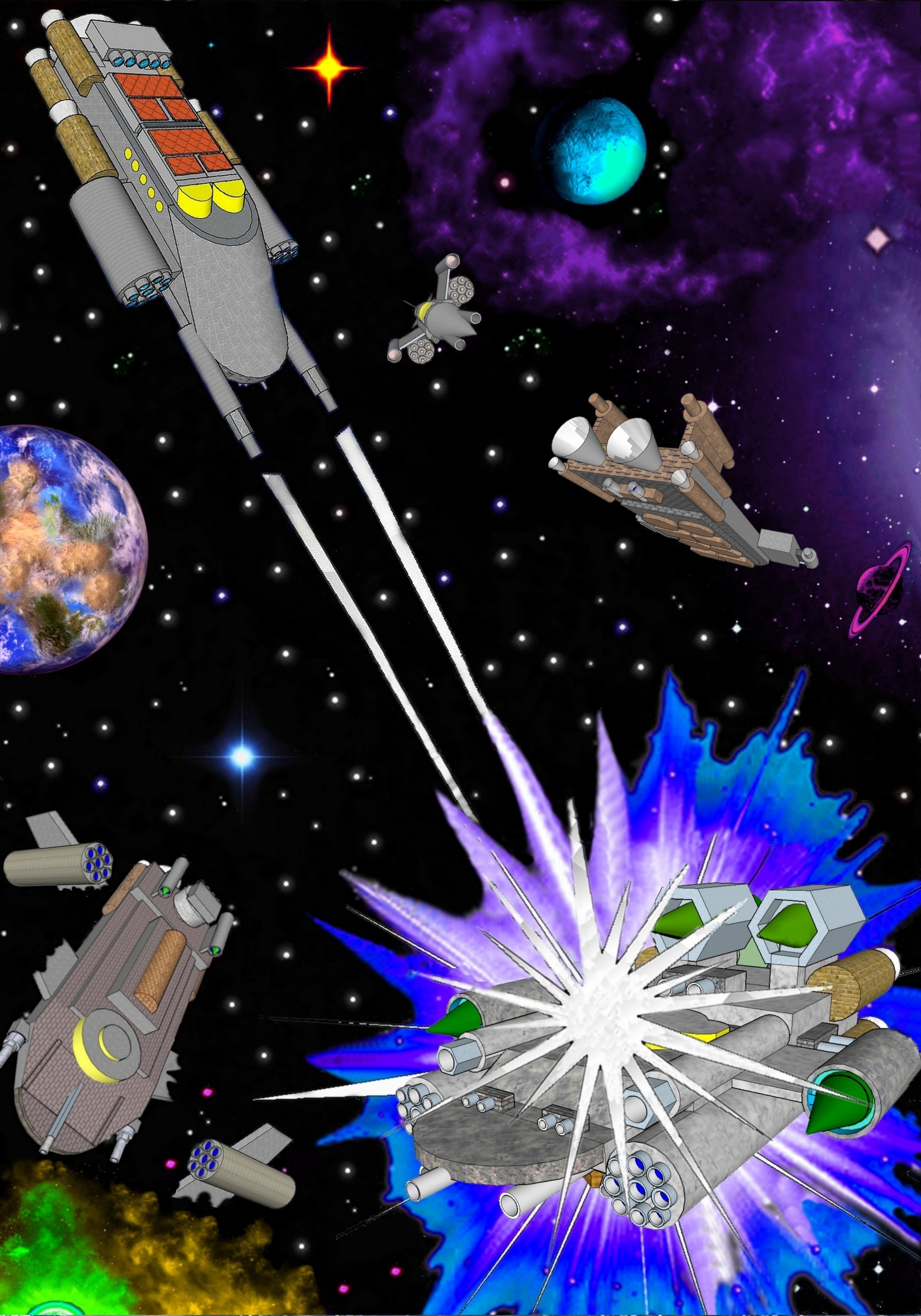 Корабли раскосых с серым оттенком кожи быстро приближались. Чётко вырисовываясь на всех мониторах. Просканировав врага, обговорили ситуацию. Двумя нашими кораблями, активируя маскировку, защиту корабля и антирадар от инфракрасного излучения, убрались подальше от дальней орбиты. Поглядывая на корабль союзников, мы увидели, как он готовится к бою. Выбрав позицию, ощетинившись какими-то стержнями с разных сторон, выпустил вокруг всего корабля какую-то молочную пелену. Сам же стал каким-то полупрозрачным, видимо задействовал для нас неизвестные временные барьеры, выжидая корабли неприятеля. Перед самой встречей с врагом защищая свой корабль, он активировал антигравитационное поле. Тем самым, получив возможность перенаправлять ядерные ракеты, которые реагируют на большую массу крейсера противника и их гравитацию. Эти ракеты, не улавливая врага, уходили далеко в сторону. Они были предназначены уничтожать корабли под энергетической защитой и маскировкой, с большой массой. Вдалеке показались две точки, они быстро росли, превращаясь в огромные многоярусные боевые корабли. Не обращая никакого внимания, на свою первоначальную цель, минуя планету, они прямым ходом направились к кораблю наших союзников. Самый огромный звездолёт неожиданно для нас начал быстро расстыковываться на два корабля, разделившись, окружая наших друзей, получил большое преимущество.
