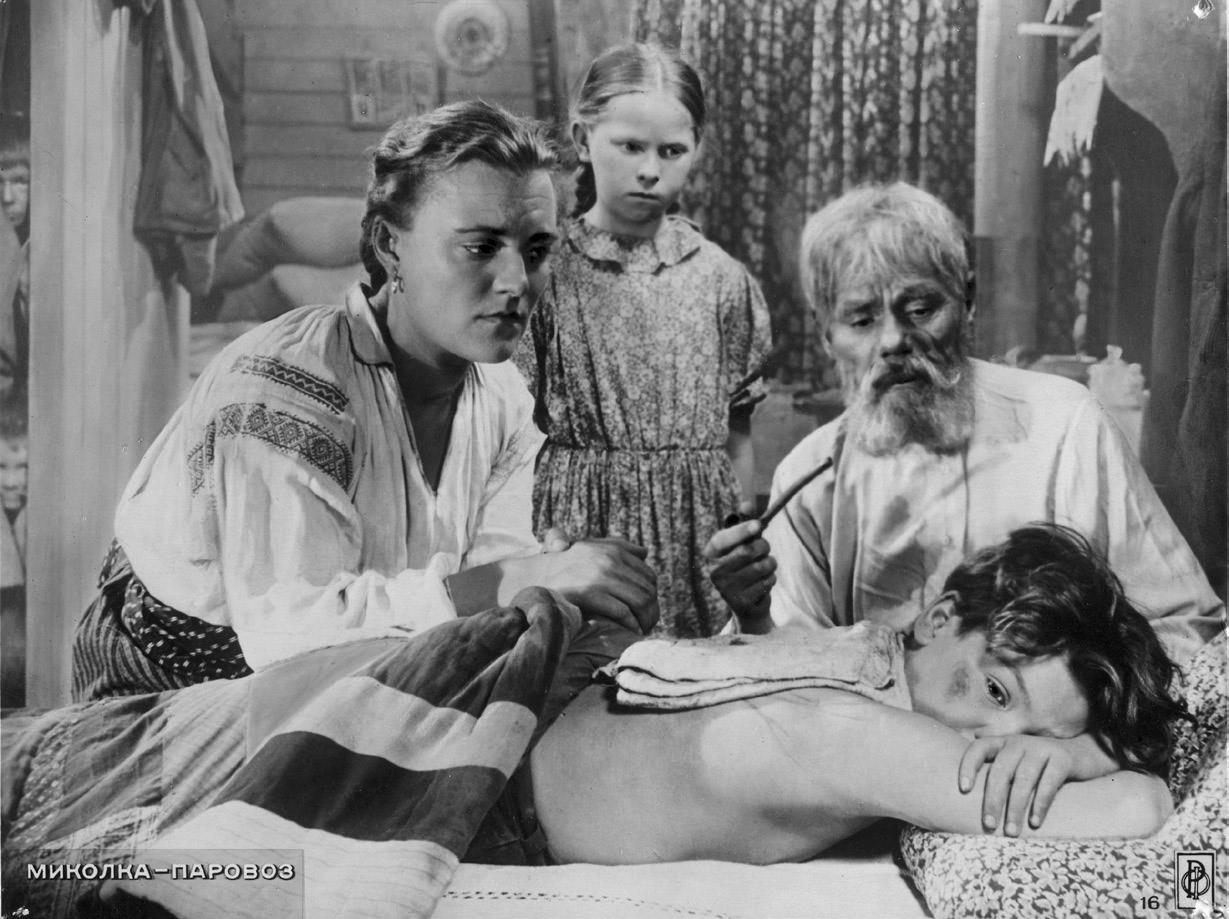 До «Миколки-паровоза» в белорусских детских фильмах избегали изображать взросление: герои-дети или не взрослели, как в безмятежном «Концерте Бетховена», или досрочно и мгновенно становились взрослыми, как в «Хромоножке» и «Детях партизана». Миколка-паровоз первый именно взрослеет, досрочно и все же постепенно: от беспечности к серьезности, от интереса к миру взрослых к первой взятой на себя ответственности, от помощи отцу к решению встать за пулемет после смерти пулеметчика (только так о взрослении умеет говорить соцреалистический мотив наследования отцам). Ключевой момент в последовательном отказе от детства – сцена в тюрьме, куда Миколка попадает, после того как был пойман с револьвером. Точнее, первой точкой роста, воспринимаемой еще игрой, становится сцена расстрела дяди Семы, которую подглядывает Миколка. В последний момент дядя Сема спасается благодаря эксцентричному Миколкиному деду, комическому персонажу, который пародирует возвышенную тему подвига и геройства. Он даже партизанит в парадном облачении с орденами за турецкую войну. В сюжете, основанном на столкновении иллюзий детства с достоверной эпохой, он действует, как громоотвод, воплощает свойственную детству травестию, ведет обертонами детскую, игровую тему: дед до последнего по-детски «играет в войнушку».