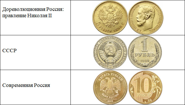 Иллюстрация 1 . Отражение изменения времени в монетах России.