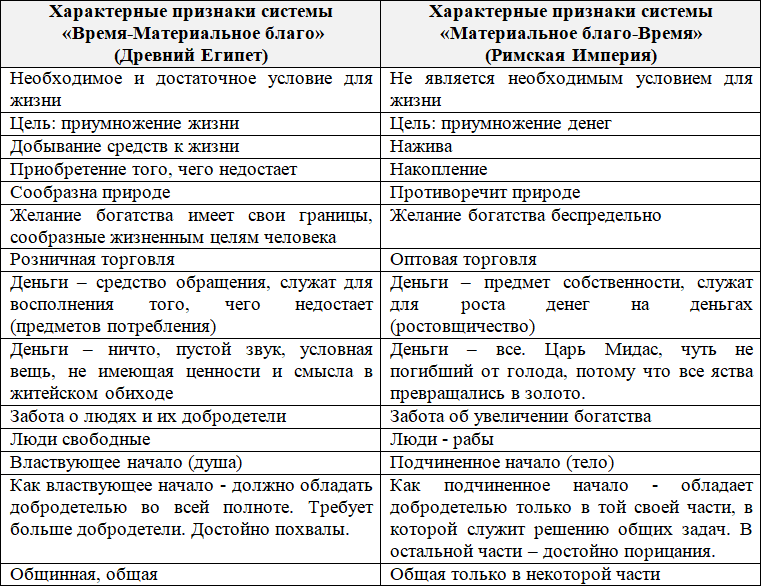 Содержательно именно об этом рассуждает Аристотель, учитель Александра Македонского, в трактате «Политика», называя эти две системы двумя видами искусства наживать состояние. Он дает отличительные признаки обеих систем (Таблица 1). Нарождающаяся новая система координат «Материя – Время» во времена Аристотеля только начинала разворачиваться, приняв свои конкретные формы несколько позднее – в период Римской Империи.