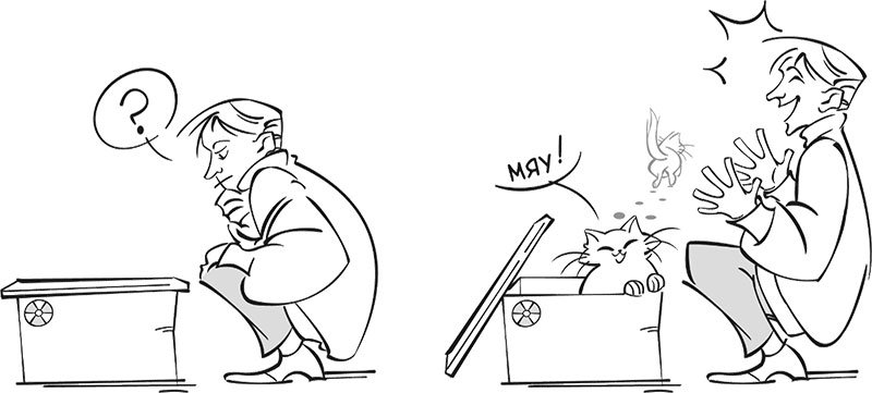 Возьмем прикрытую коробку, где находится спящий кот. Наблюдателю предстоит ответить на тот же сакраментальный вопрос: кот жив или мертв? При этом ему запрещено открывать коробку или производить какое-либо иное возмущение среды. Теперь сам наблюдатель оказывается в условиях квантовой неопределенности: он видит координату кота – коробку, но его сигнальная система (зрение, слух и др.) не имеет возможности замерить импульс кота – он не перемещается и из коробки не доносится ни звука. Пока кот безмятежно спит, для наблюдателя вероятность 50%, что там находится живой кот, и такая же вероятность, что там находится кот мертвый. Но как только от кота пошел какой-либо импульс, – он замяукал или высунул голову из коробки, – для наблюдателя становится очевидным, что кот жив, Иллюстрация 6.