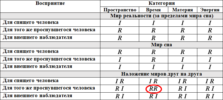 Для большей наглядности возьмем пример, когда спящий человек находится в купе двигающегося поезда. Мы будем оценивать восприятие реальности (R) или мнимости (I) происходящего внутри мира сновидений и одновременно внутри реального мира. Оценивать будут 3 участника: спящий человек, этот же человек, но уже проснувшийся, и сторонний наблюдатель, например, проводник вагона. Три участника в нашем примере выполняют роль трех разных систем отсчета. Оценка восприятия участниками реальности и мнимости процессов показана в Таблице: