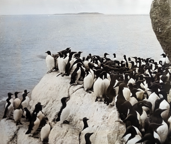 Остров Харлов. Все уступы на обрывистых скалах заняты кайрами. Гнезд они не строят, а насиживают одно яйцо прямо на лапах.