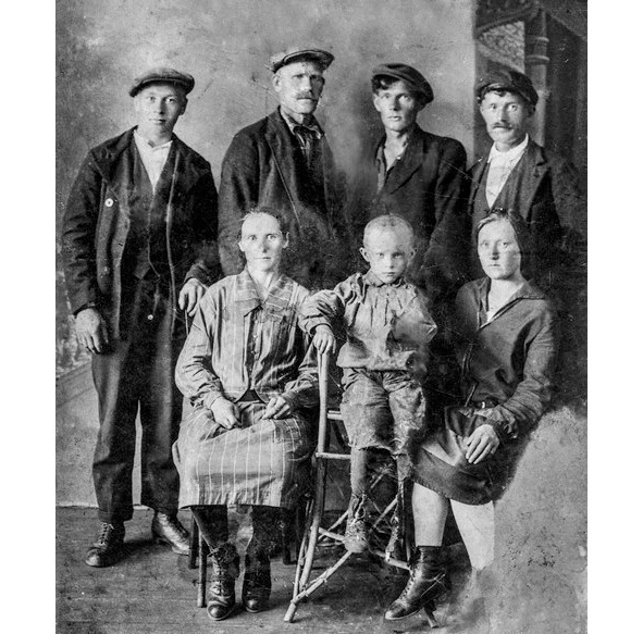 Интернационал родственников Белокаменки. Нижний ряд, слева направо – Мария Аманда, жена Игната с сыном Виктором, норвежка. Аграфена Житких, русская. Верхний ряд слева направо – Михаил Житких, русский (погиб на войне), Игнат Кеньев, карел. Дмитрий Яковлев, саам. Семен Кеньев, карел.