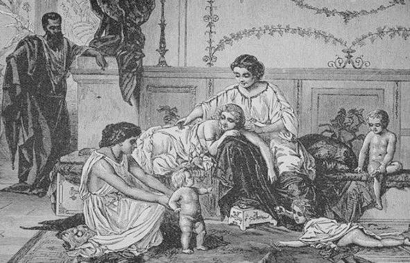 Материнство и детство в классово разделенных античных государствах было принципиально различным в богатых и бедных семьях. В состоятельных семьях мать и дети пользовались всеми благами соответственно социальному положению. Экономическая зависимость от супруга и отца не ограничивала свободу женщин в общении с другими гражданами, дети обучались и воспитывались в специализированных школах и пансионатах. Дети бедных сословий такой привилегии не имели, их «университетами» было участие в общих с родителями хозяйственных делах и общении с такими же неимущими сверстниками.