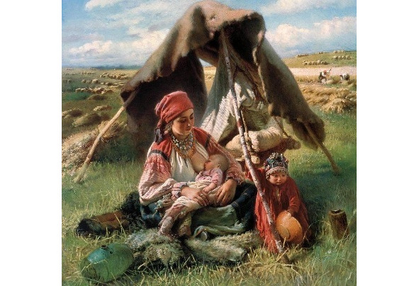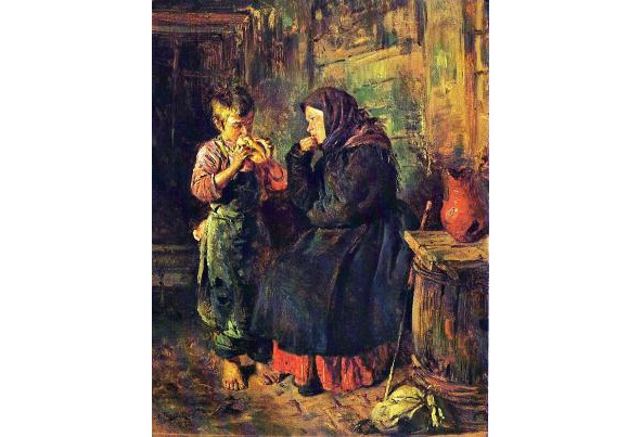 На картине великого русского художника К.Е.Маковского «Жница», создавшего много полотен о жизни простых крестьянок-тружениц, изображена женщина, в момент отдыха кормящая младенца. Рядом маленькая дочка с грустным и каким-то отрешенным недетским выражением лица, вместо игрушки держит в руке хозяйственный тазик. Время обеда, но никакой пищи не видно, кроме кувшина с водой, в лучшем случае с кислым квасом. Нет главы семьи, что напоминает безотцовщину из недалекого прошлого.