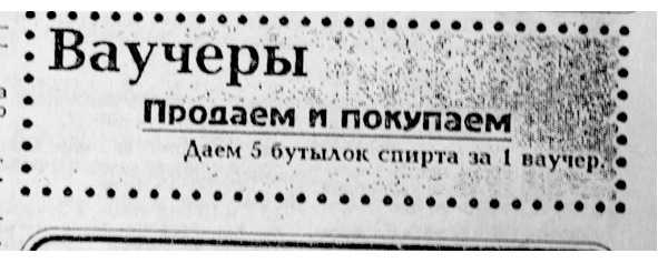 На любые проделки мастер. Сегодня нельзя без горькой усмешки и возмущения пройти мимо инцидента, связанного с обманом населения всучиванием ему бумажных государственных знаков с совершенно неведомым названием «ваучер». С наглой рекламой давались обещания неслыханного обогащения, поскольку приватизационный чек «тянул» чуть ли не на две «Волги», если его внести в приобретение рентабельного предприятия.