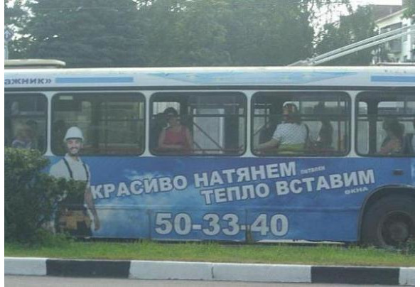Неудачная реклама более всего характеризуется юмористическим содержанием. Надпись на приведенном рисунке в словах «натянем» и «вставим» недвусмысленно проникнута сексуальными намеками, и никакого отношения к реальной заботе о благе населения не имеют.