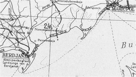 Немецкие тральщики №№ 1, 2, 3 и 5 обыскивают морскую зону вокруг затонувшего «Immanuel» на трассе «Красный», между Мариуполем и Таганрогом, разминирована 1 мина, из выставленных СКА-0412 в районе Мариуполя (NARA T1022-2530-00008).