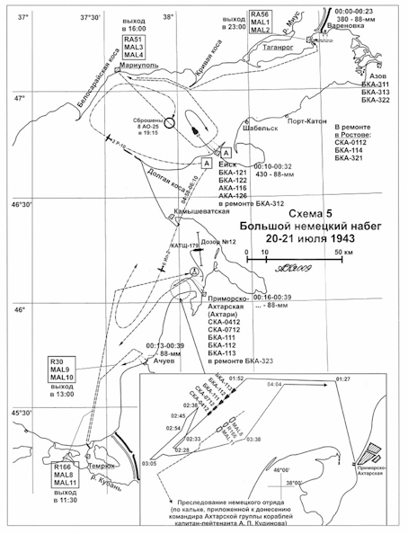Вечером 17 июля из Приморско-Ахтарской на поиск в Темрюкский залив, в районе косы Ачуевской-Темрюк, вышли СКА-0412, БКА-112 и БКА-113. У немцев вечером в «дальнем» дозоре в Темрюкском заливе находились артлихтеры MAL 8, 9, 10, в «ближнем» – 6 катеров ОХР и 6 саперных катеров при поддержке MAL 11, которые вышли из Темрюка в 19:45 (мск.20:45). Наш отряд встретил группу артиллерийских лихтеров ровно в полночь (Ш=45°29’; Д=37°31’). На море стоял штиль, противник был неплохо виден на лунной дорожке. Тем не менее, наши моряки насчитали четыре единицы («Зибели») вместо трех и сильно ошиблись с определением курса (270 градусов вместо 25). D 23:07 (мск. 00:07) азовцы первыми открыли огонь с дистанции 4-5 кабельтовых, т. е. максимум с 1000 м. MAL 8 и MAL 9 открыли ответный огонь из двух 2-сантиметровых зенитных орудий, а затем и из 8,8-сантиметровых орудий. Противник довернул влево, чтобы встретить наш отряд бортом. Однако в его рядах возникло замешательство. Концевой лихтер MAL 9 отвернул сильнее других и скрылся в западном направлении. Наши залпы, по свидетельству немцев, ложились неплохо, но попасть хотя бы раз нашим катерам не удалось. Немцы применили осветительные ракеты. Вскоре противник пристрелялся, его залпы стали давать накрытия, и советским кораблям пришлось отвернуть. В 00:22 бой прервался. Наши моряки наблюдали два больших взрыва на втором лихтере (на самом деле было попадание в MAL-8 из пулемета) в колонне, а затем еще один на головном «Зибеле». Вскоре второй паром в строю якобы начал погружаться кормой. Немцы, тем временем, отошли на запад в поисках MAL 9 и, наконец, догнали его. Теперь он двигался в голове колонны. Для восстановления контакта азовцы повернули за противником и вскоре, в 00:55, настигли его. По наблюдениям, у немцев «осталось» три лихтера, причем последний заметно отставал. На нем и сосредоточил огонь наш отряд. В артлихтер наблюдались прямые попадания, но очень быстро катера снова попали под накрытие. К этому времени было расстреляно три четверти боезапаса (218 76 мм, 350 45мм, 330 20мм снарядов, 100 12,7 мм и 530 7,62 мм патронов), поэтому советские корабли вышли из боя и взяли курс на базу. Повреждений и жертв у наших катеров не было. В 00:10 (мск. 01:10) все MAL взяли курс на север и держали его до 01:05 (мск. 02:05), в 02:00 (мск. 03:00) повернули на юг. В 04:30 MAL 8, 9, 10, 11, 6 прожекторных катеров и 6 саперных катеров вышли из полосы форпоста и вернулись в Темрюк. Расход снарядов у MAL 8: 163 – см, 126 – 8,8 см; MAL 9: 31 – 2см; MAL 10: 500 – 2см, 65 – 8,8 см) (ЦВМА, ф.72, д.3395, л.56; д.3396, л.7; д.3399, л.11; д.3402, л.12; д.3404, л.10; д.3405, л.8, 33; д.3406, л.6; д.3408, л.11; д.3409, л.9, 33; д.5818, л.7, 33; д.5821, л.8, 21; д.5822, л.6, 60, 65; NARA T1022-2595-00133-00137; NARA T1022-2535-00583, 00605).