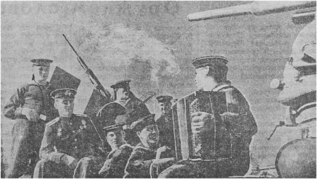 Выдалось свободное время. Моряки собрались в кружок. Сигнальщик, старший краснофлотец Худяков Г.С. берет свой баян и звучит задушевная песня