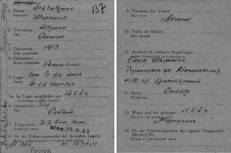 Карточка военнопленного Степана Антоновича Школенко