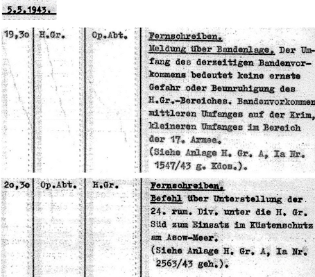 Как бы то ни было, большинство группы попало в плен. В архиве NARA, США (U.S. National Archives & Records Adminisration) были найдены документы, в которых отражена реакция немецкого командования на предполагаемую первую высадку разведчиков. Так, именно вечером 5 мая 1943 года командование группы армий «А» сообщило в оперативный отдел Верховного командования Вермахта о неких действиях «банды» в этом районе. Практически в течение часа был принято решение о передаче в подчинение группе армий «А» 24-й румынской пехотной дивизии, которая с этого момента и до сентября 1943 года занималась береговой обороной побережья Азовского моря от Бердянска до Мариуполя. Вот эти два фрагмента из журнала боевых действий (Kriegtagebuch) группы армий «А» Вермахта.