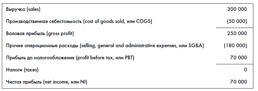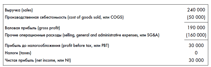 Обратите внимание, что в P&L отдельно показывается производственная себестоимость (cost of goods sold, или COGS). На нее относятся лишь прямые затраты на производство или закупку товара, которые можно идентифицировать. Для упрощения ситуации мы опустили налоги, которые будем рассматривать отдельно.
