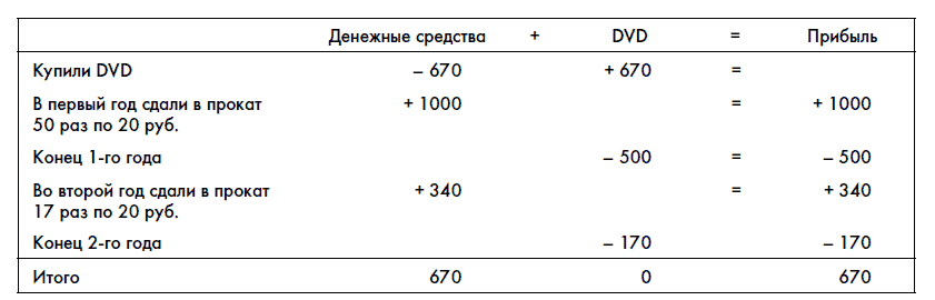 Вопрос: Какую сумму вы должны записать себе в расходы каждый год? Принцип соответствия говорит о том, что вы должны списывать свои затраты на DVD пропорционально количеству сеансов его проката. Таким образом, всего один DVD вы ожидаете давать в прокат 67 раз. Соответственно, каждый раз при прокате вы будете списывать 1/67 его стоимости.