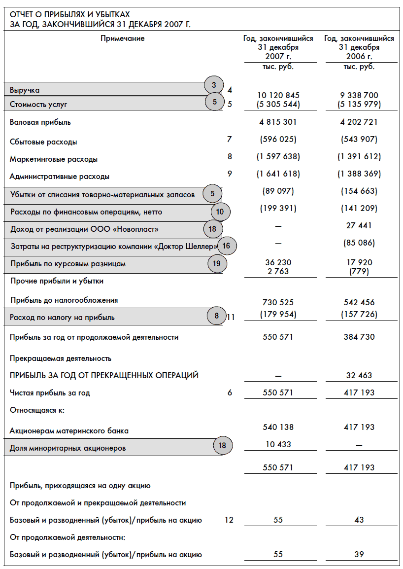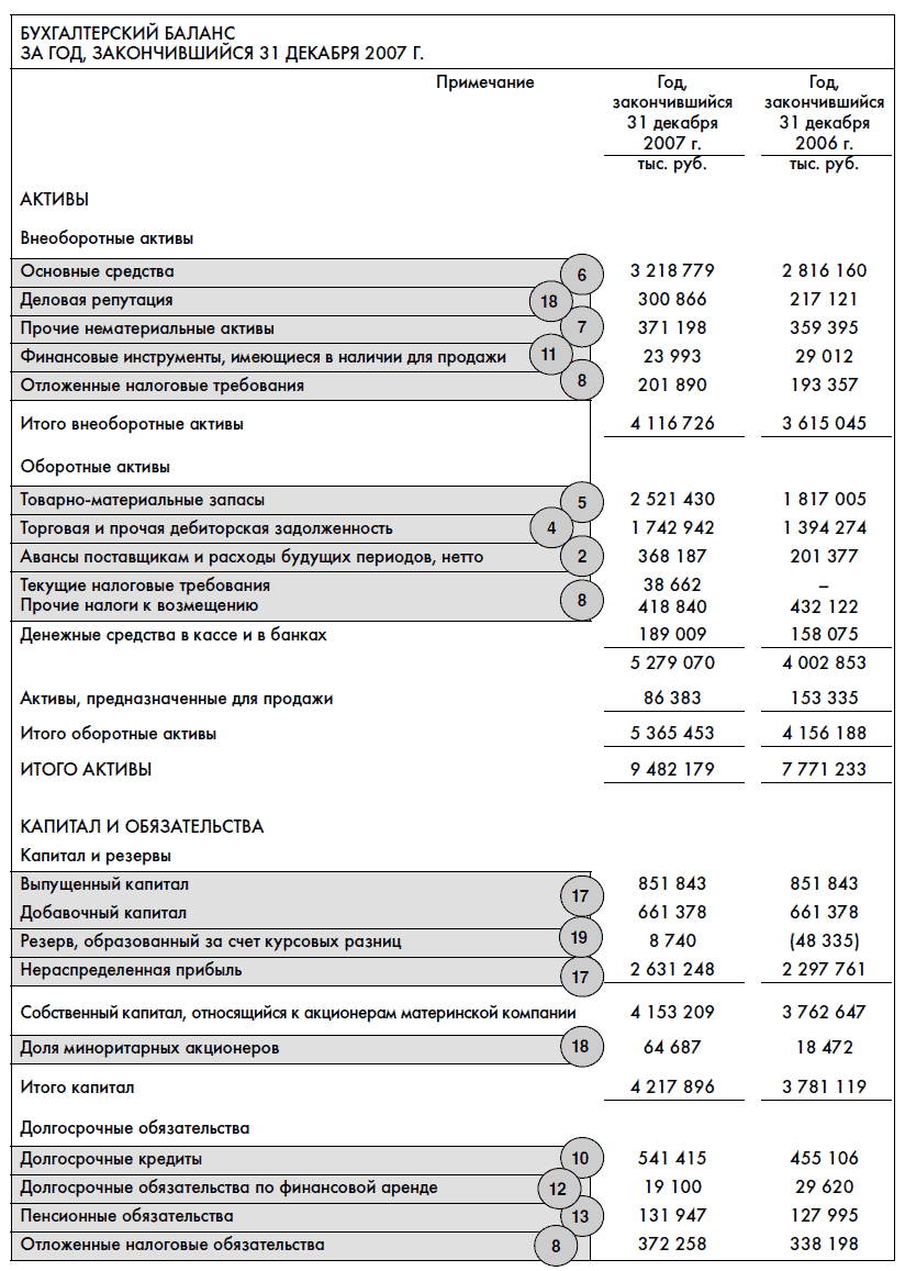 Вот пример финансовой отчетности концерна «Калина», крупнейшего производителя косметики в России. Цифры указывают главы книги, в которых мы будем более подробно рассматривать те или иные строки этой финансовой отчетности: