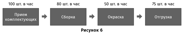 Очевидно, что в данном процессе узким местом является окраска. Общая пропускная способность системы составляет 50 изделий в час. Предположим, что предлагается проект – купить дополнительное окрасочное оборудование, чтобы удвоить мощности по окраске. Часто бывает, что считают эффект на весь дополнительный объем производства (плюс 50 изделий в час). Однако из схемы очевидно, что реально объем производства повысится только до 75 шт. в час, так как после этого узким местом системы станет отгрузка. Чтобы повысить объем производства до 100 шт. в час, потребуются существенные дополнительные инвестиции на «расшивку» отгрузки, а затем и сборки. В этом случае экономический эффект проекта увеличения мощностей по окраске можно учитывать только на дополнительные 25 единиц. Такое уменьшение может заметно сказаться на окупаемости проекта. Об этом часто забывают.