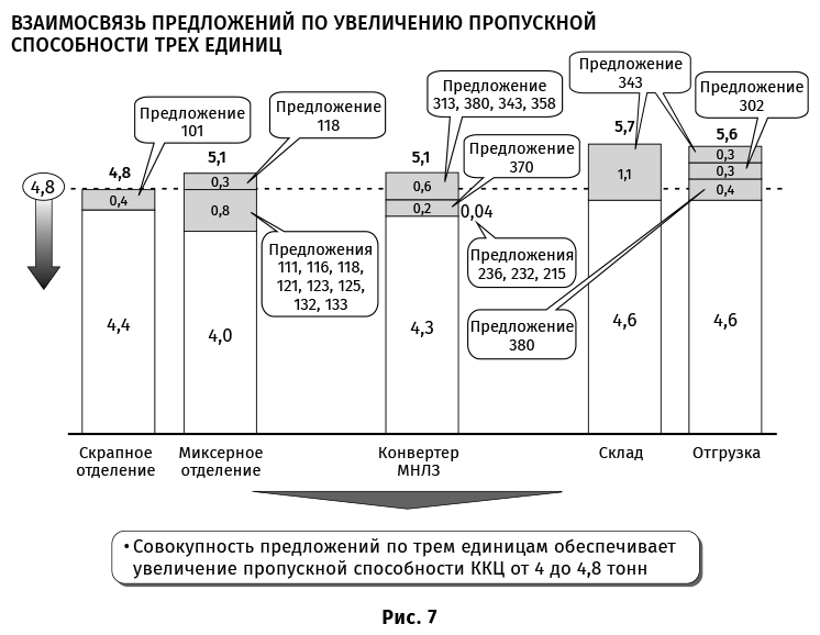 Что делать, чтобы не допустить подобную ошибку? Прежде всего, надо точно определить узкое место системы. Для этого полезно провести анализ и сделать схему материальных потоков и мощностей производства с полным расчетом максимальных объемов на каждом участке цеха и между цехами (с учетом пропускной способности транспортной инфраструктуры), чтобы определить узкие места. Далее предлагаемые инвестиционные проекты по увеличению объема производства надо анализировать комплексно, чтобы понять, действительно ли они расшивают узкие места и до каких пределов. Вот, например, ряд проектов, которые суммарно должны расшить пропускную способность цеха производства стали металлургического предприятия (рис. 7). Как видите, расшивка достигается за счет комплекса проектов. Узким местом является скрапное отделение, хотя до начала проведения проектов узким местом оно не являлось.