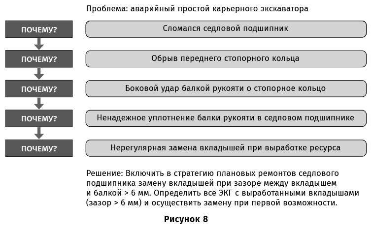 Что делать, чтобы не допускать такой ошибки? На практике хорошо работает метод Пяти «А что дальше?». Его принцип сходен с принципом Пяти «Почему?», используемом в операционном менеджменте. Когда вы хотите докопаться до сути проблемы, можно построить анализ на принципе Пяти «Почему?» (рис. 8). Этот принцип позволяет добраться до причины сквозь внешние проявления проблемы.