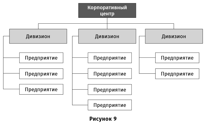 На верхнем уровне компании находится корпоративный центр, роль которого может меняться в зависимости от организации, но в основном это некий единый центр управления общекорпоративными вопросами компании, такими как стратегия, финансирование, отчетность и т. д. Поскольку в крупные компании входят десятки разнородных предприятий, управлять ими всеми из корпоративного центра сложно. В связи с этим крупные компании в качестве следующего уровня управления создают дивизионы. Дивизионы управляют группами предприятий, объединенных по некоему признаку, в основном по продуктовому. Например, крупные вертикально интегрированные горно-металлургические компании обычно имеют три дивизиона: «Уголь», «Руда» и «Сталь». «Уголь» управляет шахтами. «Руда» – добычей руды (горно-обогатительными комбинатами). «Сталь» – металлургическими заводами и заводами, производящими конечную продукцию из металла (иногда конечные продукты выделяют в отдельный дивизион «Метизы»). Крупные нефтяные компании обычно имеют дивизионы «Разведка и добыча» (собственно добыча нефти, или так называемый upstream) и «Переработка и маркетинг» (нефтеперегонные заводы и заправки, или downstream). На третьем уровне управления крупной компании находятся сами предприятия, которые производят продукцию. Безусловно, существуют различные варианты организационных структур, которые мы не будем рассматривать здесь – это тема отдельной книги.