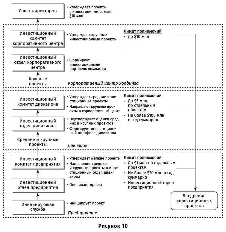 Инвестиционный процесс крупной компании учитывает многоуровневую структуру. Логика при этом проста – чем важнее проект (обычно чем выше инвестиции проекта), тем на более высоком уровне управления компании он рассматривается и контролируется. Вот, например, схема рассмотрения инвестиционных проектов крупной промышленной компании (рис. 10).