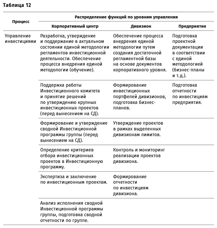 А вот распределение полномочий и ответственности по уровням управления в инвестиционном процессе (табл. 12).