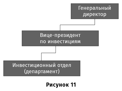 ● В виде отдельной структуры. В этом случае в корпоративном центре имеется отдельный топ-менеджер с прямым подчинением генеральному директору компании, отвечающий за инвестиции (его должность называется, например, вице-президент по инвестициям). Соответственно, ему подчиняется инвестиционное подразделение. В этом случае обычно подобная же структура имеется и на уровне дивизионов, и на уровне предприятий (рис. 11).