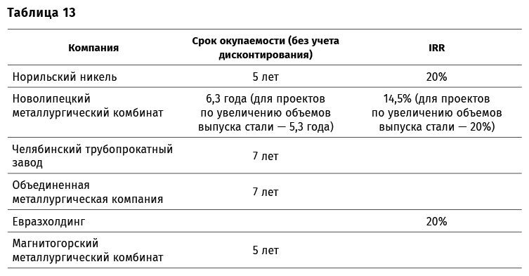 Вот, например, критерии принятия инвестиционных проектов некоторых российских компаний (табл. 13).