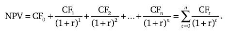 Проведя подобную процедуру со всеми денежными потоками проекта и просуммировав получившиеся «сегодняшние» деньги, мы получим чистую дисконтированную стоимость проекта (net present value – NPV), то есть стоимость проекта для инвестора в «сегодняшних» деньгах: