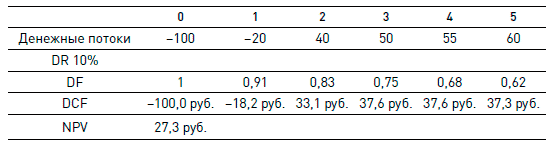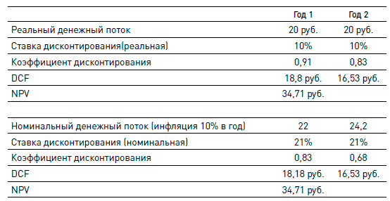 В данном случае реальный денежный поток первого года (20 руб.) будет продисконтирован по ставке в 10 %, номинальный денежный поток первого года (22 руб.) будет продисконтирован по ставке 21 %. Обратите внимание, что дисконтированные значения каждого года в обоих методах равны (18,18 руб.). То же самое справедливо и для всех последующих лет. Таким образом, оба метода расчета дают в конечном итоге одно и то же значение NPV: