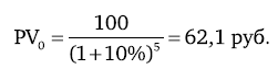 Обратите внимание на следующий момент: для формулы мы используем денежный поток «первого» года, а PV получаем на текущий момент или «нулевой» год. В данном случае «нулевым» годом для нас будет пятый, а «первым» – шестой год. Иными словами, полученное значение в 100 рублей – это терминальная стоимость на конец пятого года (в деньгах «пятого года»). Чтобы привести ее к общему знаменателю, для расчета NPV нам нужно продисконтировать 100 рублей к началу нулевого года (то есть к деньгам «сегодня»):