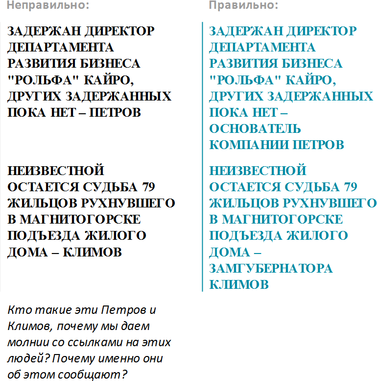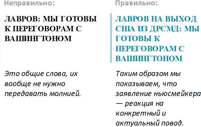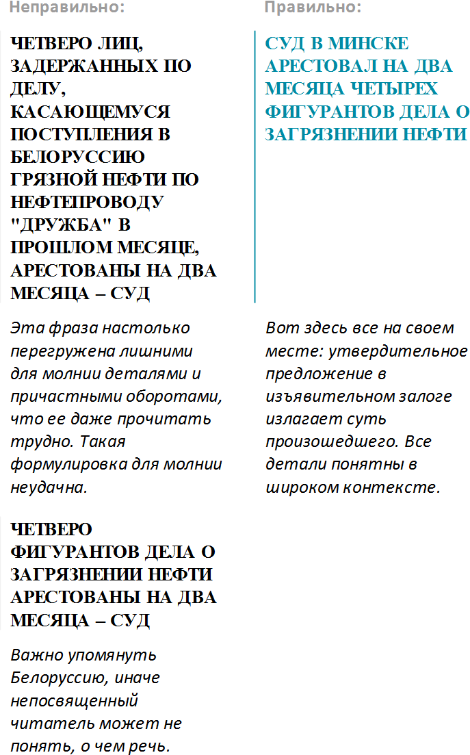 Лучше всего давать молнии в форме простых тезисов, но иногда нельзя обойтись без более сложных конструкций. Бывает, например, что высказывание ньюсмейкера звучит слишком неконкретно и не несет особой смысловой нагрузки без упоминания конкретного информационного повода.