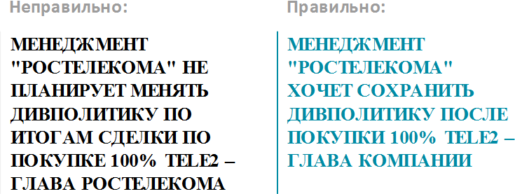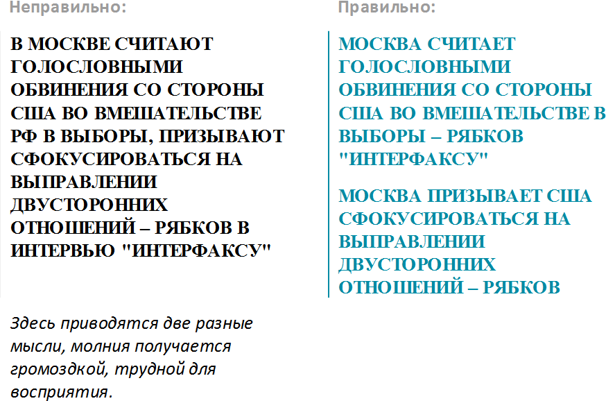 Молния должна быть корректно сформулированаМолния должна донести важнейшую информацию до подписчика быстро, коротко и ясно, но при этом ни в коем случае нельзя искажать смысл. Такой риск всегда существует, поэтому при передаче молний надо быть очень внимательным к формулировкам.