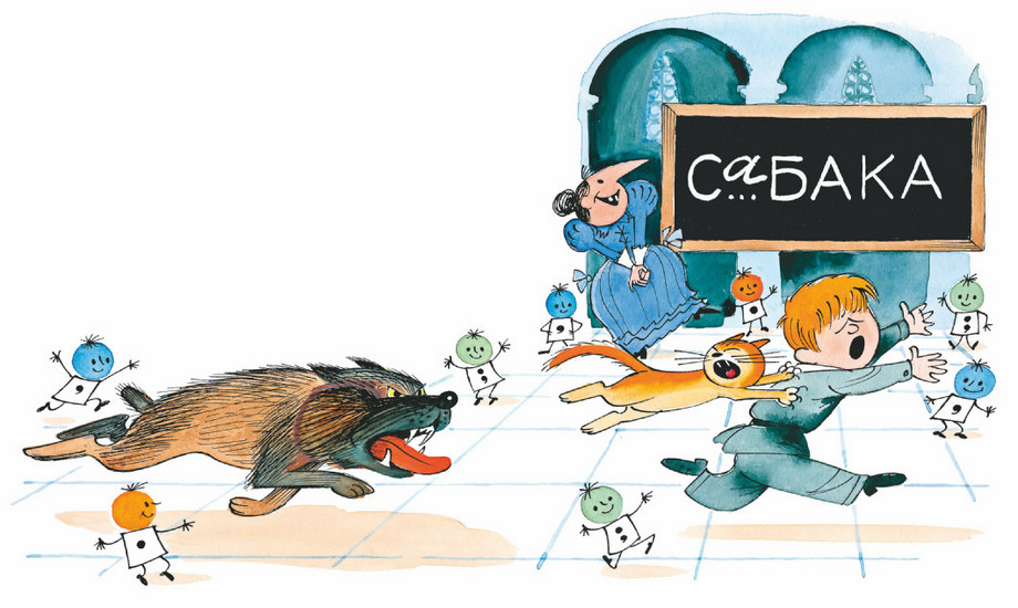 Запятая расхохоталась. Глагол нахмурил седые брови. Восклицательный заахал и заохал. Собака оскалилась и зарычала на меня. Я испугался её злой морды и побежал. Она погналась за мной. Кузя отчаянно шипел, вцепившись когтями в мою куртку. Я догадался, что неправильно вставил букву. Вернулся к доске, стёр «а» и написал «о». Собака тут же перестала рычать, лизнула мою руку и выбежала из зала. Теперь я никогда не забуду, что собака пишется через «о».