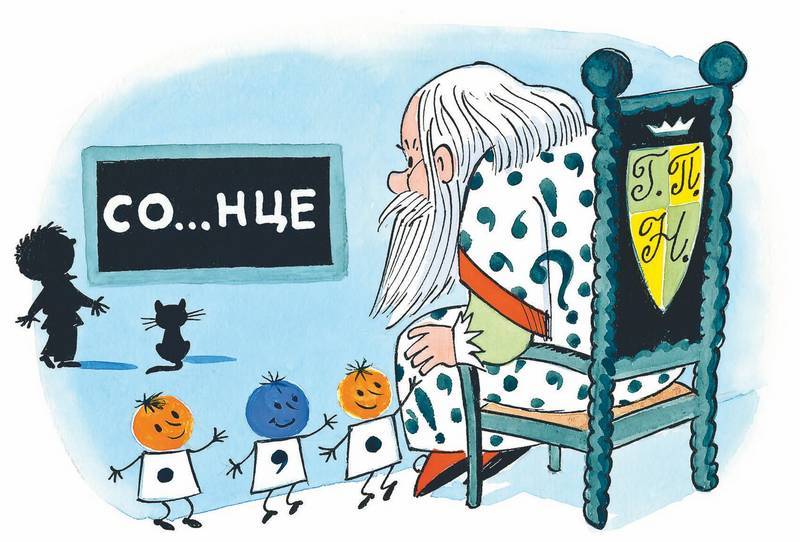 Я прочёл ещё раз: «Со…нце». По-моему, тут ничего не пропущено. Если все буквы на месте, зачем же вставлять лишние? Что было, когда я об этом сказал! Запятая хохотала как сумасшедшая. Восклицательный плакал и ломал ручки. Глагол хмурился всё больше и больше. Луч солнца скрылся. А в зале стало темно и очень холодно.