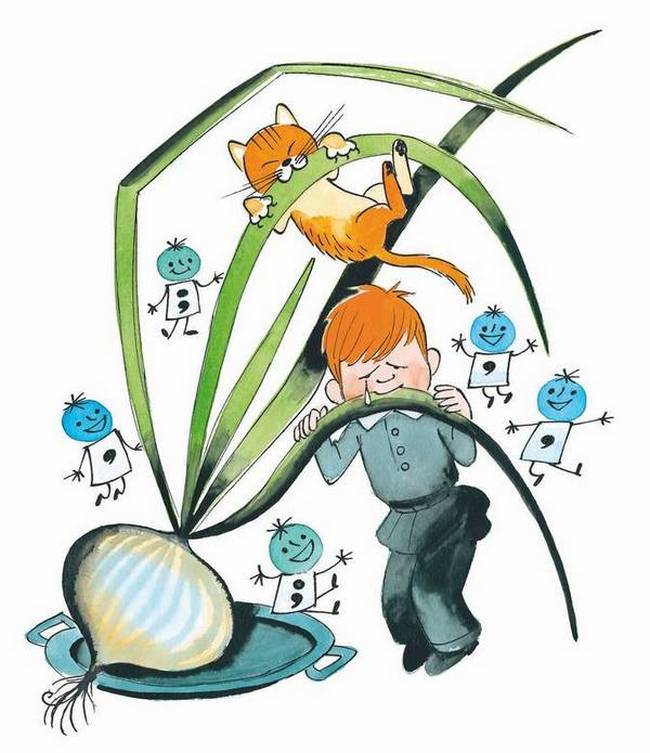 Одно съедобное слово я, пожалуй, мог бы написать правильно. Я стёр «колбасу» и написал «лук». Тотчас же явились точки и внесли на блюде очищенный лук. Кот обиделся и зафыркал. Он не ел лука. Я его тоже не любил. А есть хотелось ужасно. Мы начали жевать лук. Из глаз потекли слёзы.