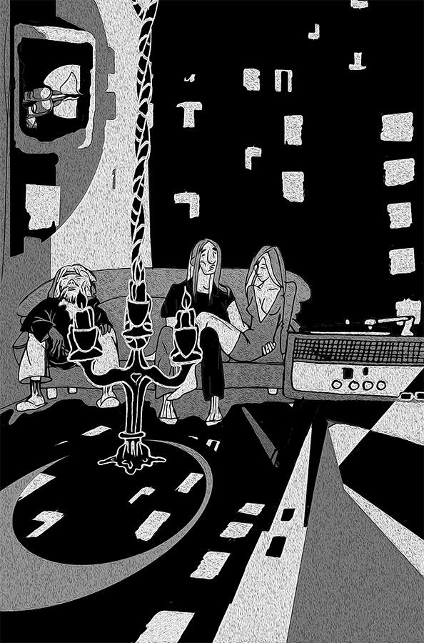 В комнате уже сидят трое: длинноволосый ровесник с бэйби, укутанные в складки темноты, завороженно уставились на вращающийся канделябр, заменяющий здесь люстру, и незнакомый мне человек угрюмо курит длинную и явно не табаком забитую беломорину.