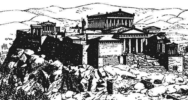 Рис. 11. Акрополь в Афинах. V в. до н. э. В центре – Парфенон, под ним – Пропилеи, слева – Эрехтейон, справа – храм Бескрылой Победы
