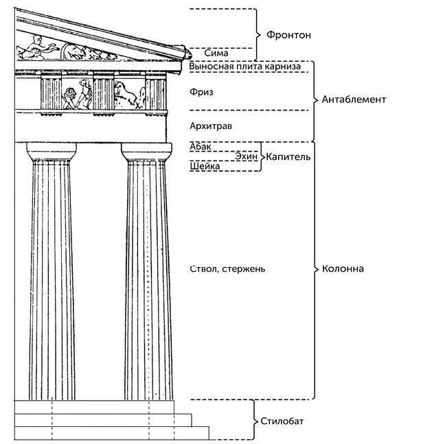 Наиболее хорошо сохранившаяся и, может быть, наиболее интересная в архитектурном отношении часть Парфенона – его наружные колоннады – представляет собой замечательный пример художественно разработанной стоечно-балочной конструкции. Сущность стоечно-балочной конструкции, в отличие от стены и свода, заключается в наличии отдельно стоящих вертикальных опор, пролеты между которыми перекрыты горизонтальными перекладинами, сделанными, например, из дерева или камня. Такие перекрывающие пролет перекладины называются архитравом или архитравными балками, а самая система перекрытия – перекрытием архитравным, в отличие от сводчатого. Перекрытие в своде не только давит на опоры сверху вниз, но и распирает их в стороны; в стоечно-балочной конструкции балки давят на опоры только сверху вниз, а напряжение действующих в ней главных сил сводится к тяжести горизонтальной нагрузки и к противодействию ей в вертикальной опоре. Художественная переработка стоечно-балочной конструкции и состоит прежде всего в выявлении указанных двух сил, действующих в противоположных направлениях: сверху вниз и снизу вверх.