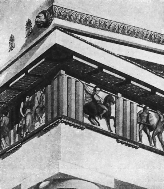 Архитрав Парфенона состоит из массивных нерасчлененных каменных плит, перекинутых с одной колонны на другую. На нем нет никакого орнамента. Ничто в нем не перебивает впечатления тяжести, с одной стороны, и массивной прочности – с другой. В соответствии с массивностью и высотой архитрава и всего антаблемента в целом находится общая опорная сила колоннады: расстановка и мощность отдельных колонн в ней даны с таким расчетом, что их опорная сила как раз соответствует лежащей на них нагрузке, в чем легко убедиться, меняя пропорции антаблемента и колонн. В современных городах, изобилующих колонной архитектурой, постоянно приходится встречать примеры нарушения этого соответствия: то колонна слишком толста для слабого антаблемента, то антаблемент чересчур массивен и как бы грозит раздавить слишком хрупкие для него колонны.