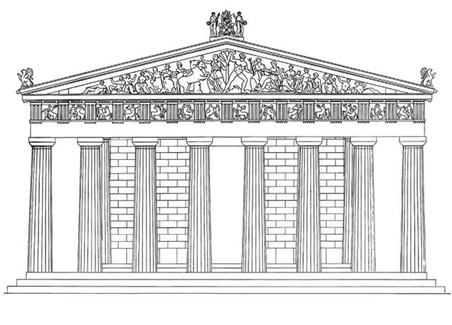 Триглифы играют чрезвычайно важную и разностороннюю роль в общей композиции Парфенона, в чем легко убедиться, закрыв их на рисунке узкой полоской бумаги и поставив на ней по концам антаблемента две вертикальные черты.