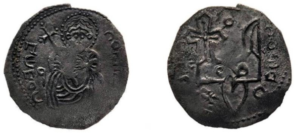 Изображение княжеского знака в виде двузубца, левый зубец увенчан крестом. Сверху между зубцами значок в виде развернутой зеркально буквы Ъ. Колончатая надпись по сторонам фигуры святого: ОГЕОС ПЕТРОС+. Вокруг двойной точечный ободок.